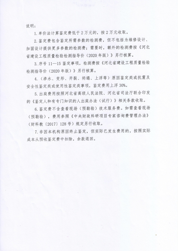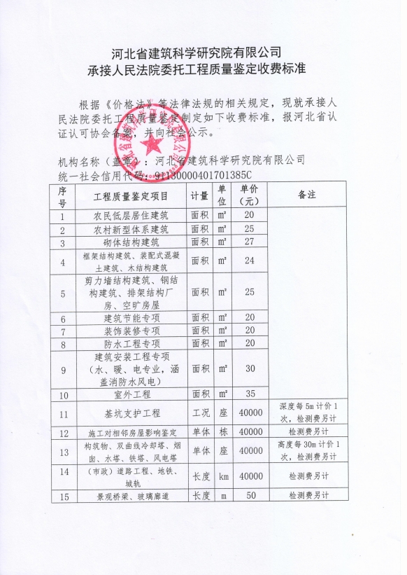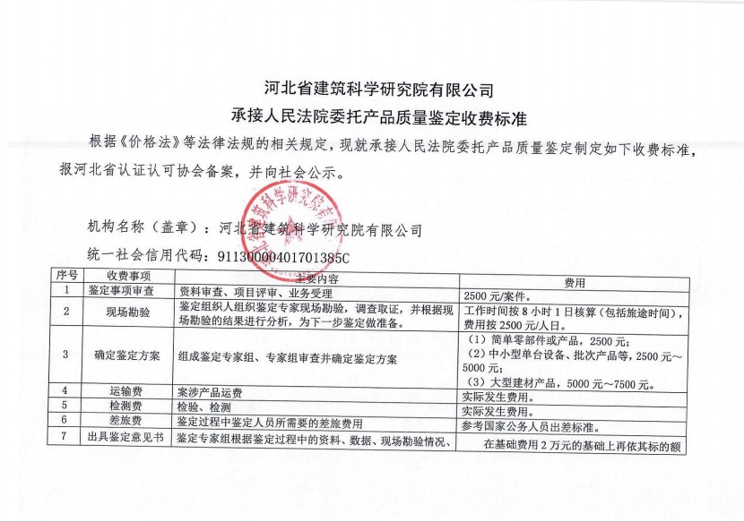 根據(jù)《河北省認(rèn)證認(rèn)可協(xié)會(huì)產(chǎn)品質(zhì)量鑒定管理辦法(試行)》第36條、《河北省認(rèn)證認(rèn)可協(xié)會(huì)工程質(zhì)量鑒定管理辦法(試行)》第35條“目前國(guó)家物價(jià)管理部門未對(duì)工程質(zhì)量鑒定收費(fèi)進(jìn)行統(tǒng)一定價(jià),鑒定機(jī)構(gòu)應(yīng)當(dāng)公示本機(jī)構(gòu)收費(fèi)標(biāo)準(zhǔn)”之規(guī)定,我公司參照財(cái)政部財(cái)科教【2017】128號(hào)《中央財(cái)政科研項(xiàng)目專家咨詢費(fèi)管理辦法》中的有關(guān)規(guī)定,并結(jié)合我公司產(chǎn)品質(zhì)量鑒定和工程質(zhì)量鑒定中鑒定專家工作的實(shí)際情況,制定了《河北省建筑科學(xué)研究院有限公司產(chǎn)品質(zhì)量鑒定/工程質(zhì)量鑒定收費(fèi)標(biāo)準(zhǔn)》(見附件)。現(xiàn)予以公示。